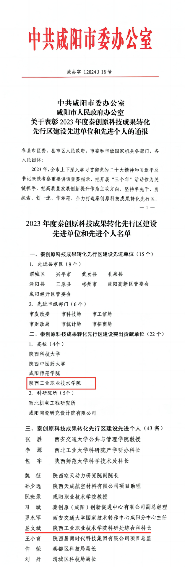 近日,根据《咸阳市委市政府表彰2023年秦创原科技成果转化先行区先进单位和先进个人》(咸办字〔2024〕18号)文件,我校荣获2023年秦创原科技成果转化先行区建设突出贡献单位,科研处屈文斌获秦创原科技成果转化先行区建设先进个人。