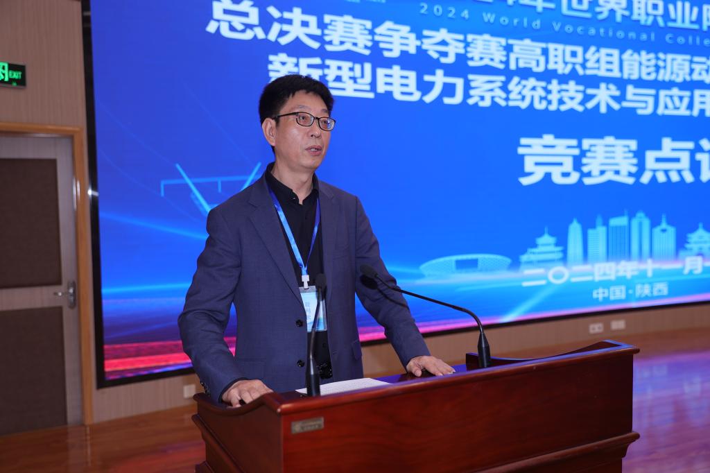 闭赛式现场,新型电力系统技术与应用赛项裁判长宋奇吼作赛事技术点评和裁判工作总结,中共陕西省委教育工作委员会、陕西省教育厅二级巡视员高巍,陕西省教育厅职业教育与成人教育处副处长周杰,开云手机官方版在线入口党委副书记、校长刘永亮,开云手机官方版在线入口副校长梅创社出席闭赛式并为获奖选手颁奖。