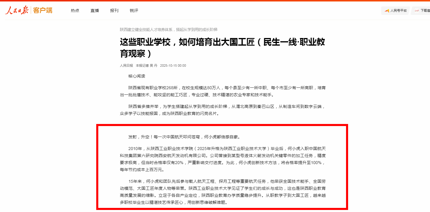 15年来,何小虎和团队先后参与载人航天工程、探月工程等重要航天任务,他荣获全国技术能手、全国劳动模范、大国工匠年度人物等荣誉。陕西工业职业技术大学见证了学生们的成长与成功,这也是陕西职业教育高质量发展的缩影。立足于各自产业定位,陕西职业教育办学质量稳步提升。从职教学子到大国工匠,越来越多职校毕业生以精湛技艺传承匠心,用创新思维破解难题。
