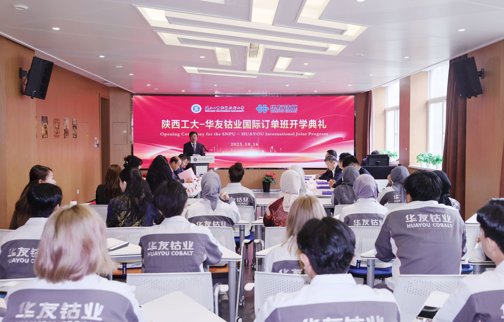 10月16日上午,陕西工业职业技术大学与浙江华友钴业股份有限公司共建的印度尼西亚国际订单班开学典礼在渭城校区顺利举行。华友钴业集团人力资源管理中心总经理李谦、副校长梅创社出席典礼并致辞。校企双方相关部门负责人、订单班全体师生共同见证了这一深化产教融合、共育国际人才的重要时刻。