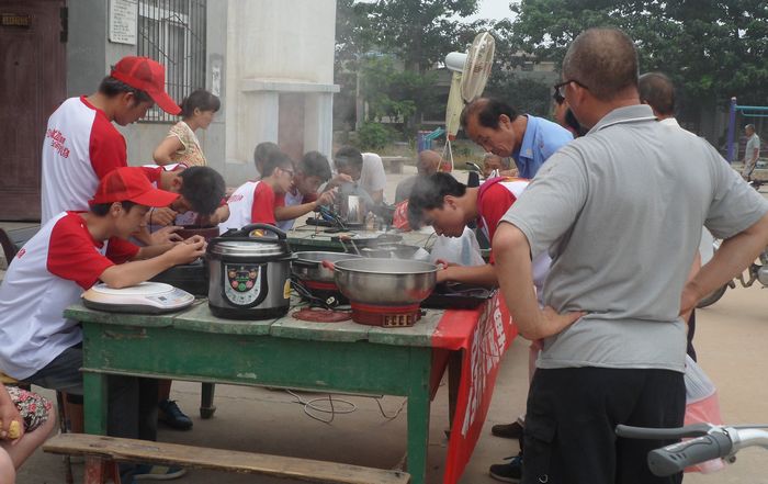 “科技兴农·共建和谐”家电维修服务队在学院电器维修协会会长朱小予的带领下,带着维修工具、电器零件,冒着酷暑来到我院的文明共建村——北杜镇成仁村,为这里的村里义务维修小家电。听到志愿者要来的消息,乡亲们早早地就把各种待修的家用电器搬到了服务台前。维修队员一赶到现场,就抛却路途疲惫和高温不适,马上投入维修工作,希望为乡亲们多修理几件电器。队员们吃苦耐劳的精神深受当地群众赞扬,张大爷手拿着刚修好的电饭锅高兴地说:“这些学生娃,能吃苦,技术好,待人热情,可帮了乡亲们的大忙啦。”