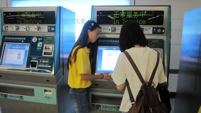 林容同学(左)在西安小寨地铁站参加志愿服务