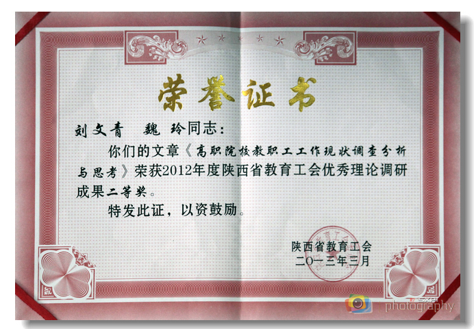 日前,从陕西省教育工会2012年度工运理论研究会上传来喜讯,由我院工会主席刘文青和图书馆教师魏玲联合调研、撰写的工运研究成果《高职院校教职工工作现状调查分析与思考》一文荣获陕西省教育工会2012年度优秀理论调研成果二等奖,刘文青同志代表学院上台领奖。