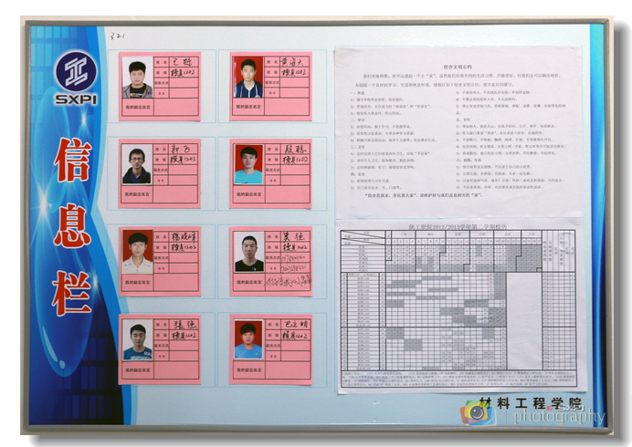 为强化“三风”建设成果,加强学生养成教育,材料工程学院于5月份启动了以“创新宿舍文化,构建和谐家园”为主题的学生宿舍“舍风”建设活动,对明伦园1号公寓楼的该学院2012级学生宿舍进行规划布置,营造了健康积极、乐学向上的宿舍文化氛围。