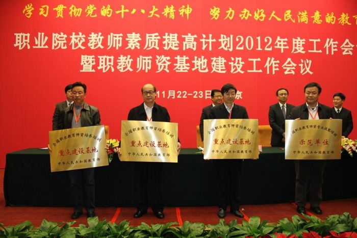 会议主题为学习贯彻党的十八大精神、全面落实全国教师工作会议要求、交流部署职业院校教师素质提高计划工作和国家级职教教师师资基地建设工作。大会为2012年新增国家级职业教育师资基地进行授牌,并举行了中等职业学校教师素质提高计划师资培训方案、课程和教材开发项目成果首发式。我院作为2012年新增国家级职业教育师资基地接受了授牌。