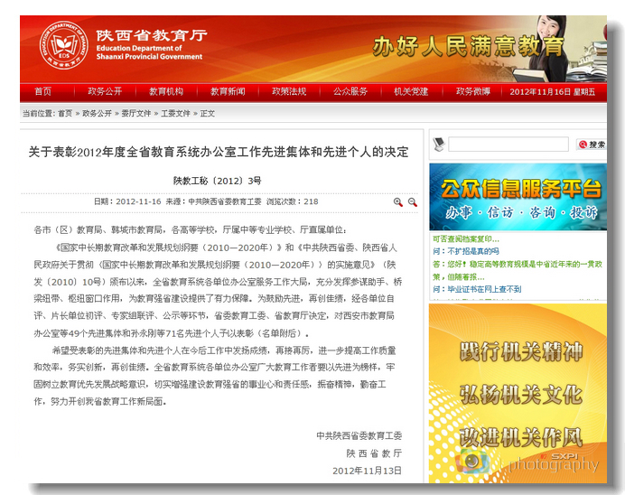 11月16日,根据中共陕西省委教育工委、省教育厅《关于表彰2012年度全省教育系统办公室工作先进集体和先进个人的决定》(陕教工秘〔2012〕3号文件)精神,我院党政办公室与全省48个地市和兄弟院校党政办公室被授予“全省教育系统办公室工作先进集体”荣誉称号,党政办主任朱忠军被评为“2012年度全省教育系统办公室工作先进个人”。