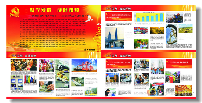 展览通过10块图文并茂,内容详实的版面系统介绍了中国十年间的发展成就,内容涉及人民生活全面改善,文化事业进一步繁荣、生态文明积极进展、党建工程扎实推进等,以喜庆的大红色彩为主调,辅以天安门、红旗、祥云的映衬,让观展师生切身感受国家的发展,坚定为实现国家的繁荣富强贡献力量的信念。