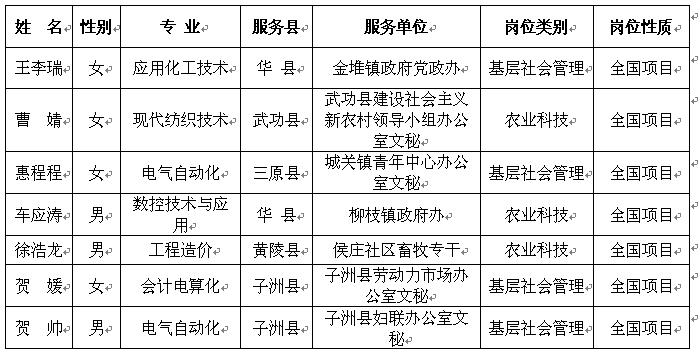 2012年大学生志愿服务西部计划从2012年4月启动以来,院团委和二级学院团总支广泛宣传,积极动员,共有40名学生网上报名,通过笔试、面试、公示等环节,院团委对报名学生思想政治素质、学习成绩、在校表现、健康状况等综合考察,择优选拔,经团省委审核,最终确定化工200903班王李瑞、会电0905班贺媛、自动化0904班贺帅等七名同学为“2012年西部计划志愿者”,分别赴华县、武功、三原、子洲等地进行一年的服务。据统计,这是我院自参加大学生志愿服务西部计划以来入选人数最多的一次。