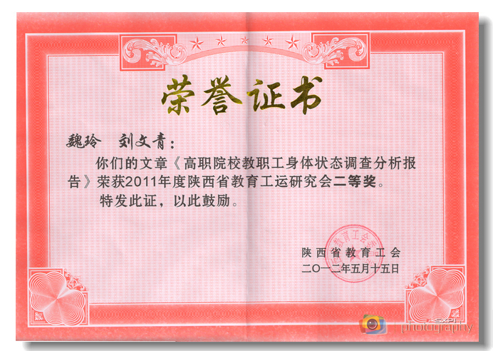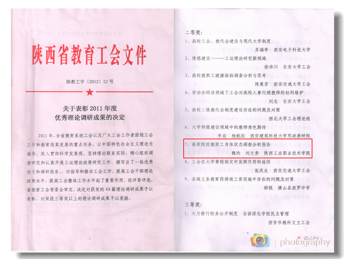又讯 在刚刚结束的陕西省教育工会2011年度工运理论研究会年会上传来喜讯,由我院图书馆教师魏玲和工会主席刘文青联合调研、撰写的工运研究成果——《高职院校教职工身体状况调查分析报告》荣获陕西省教育工会2011年度优秀理论调研成果二等奖。