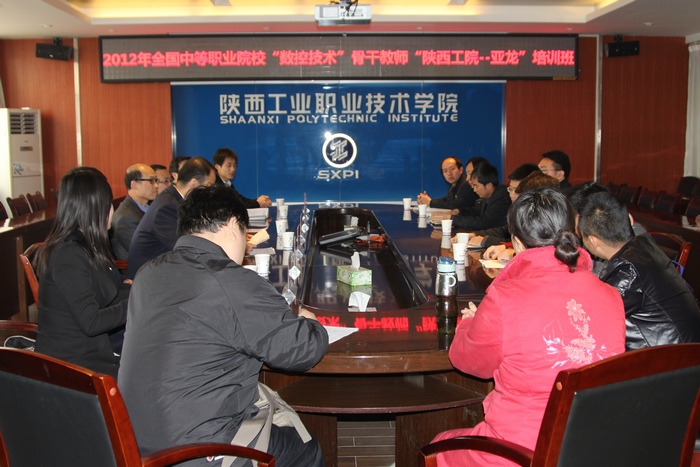 3月26日上午,2012年全国中等职业院校“数控技术”骨干教师“陕西工院—亚龙”培训班在我院正式开班,来自福建、山东、湖北、安徽、浙江、陕西等省中职学校及相关企业的15名学员将在我院接受为期五天的技术培训。亚龙公司西北地区总监李波、陕西销售经理侯娟桃、亚龙数控培训讲师李岩、我院副院长王晓江、数控工程学院卢文澈院长、南欢副院长、数控国家裁判员——我院教师王彦宏以及全体学员在崇文楼九楼会议室参加了开班典礼。典礼由数控学院院长卢文澈主持。