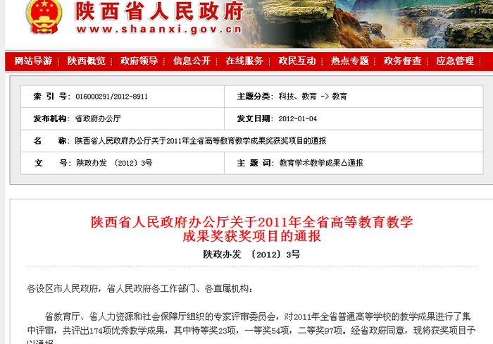 据悉,2011年陕西省高等教育教学成果奖评选活动由省教育厅、省人力资源和社会保障厅组织进行,共评出174项优秀教学成果,其中特等奖23项,一等奖54项,二等奖97项。