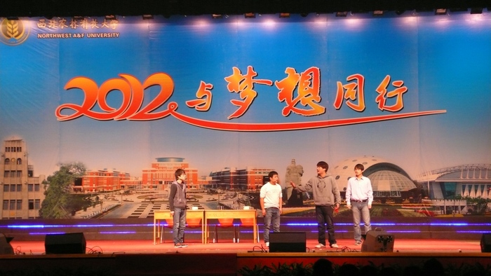 12月31日晚,我院获陕西省第三届大学生艺术展演一等奖、陕西省第三届大学生戏剧节优秀表演奖的小品《一张饭卡》应西北农林科技大学邀请,参加了该校在北校区绣山活动中心举行的2012年元旦晚会——“与梦想同行”大型文艺演出,西农大党委书记张光强、校长孙其信、中国工程院院士山仑研究员、我院学生工作部部长王超联和该校两千余名师生共同观看了演出。