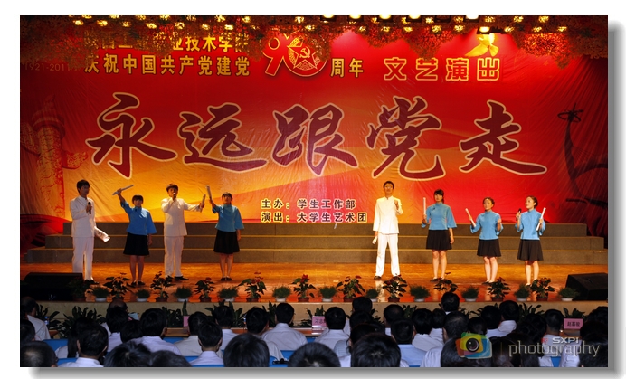 为热烈庆祝中国共产党建党九十周年,6月28日下午,由学生工作部主办的“永远跟你走”——庆祝中国共产党建党90周年文艺演出在我院明德堂隆重举行。党委书记邓志辉,院长崔岩、全体党员干部及千余名学生观看了演出。