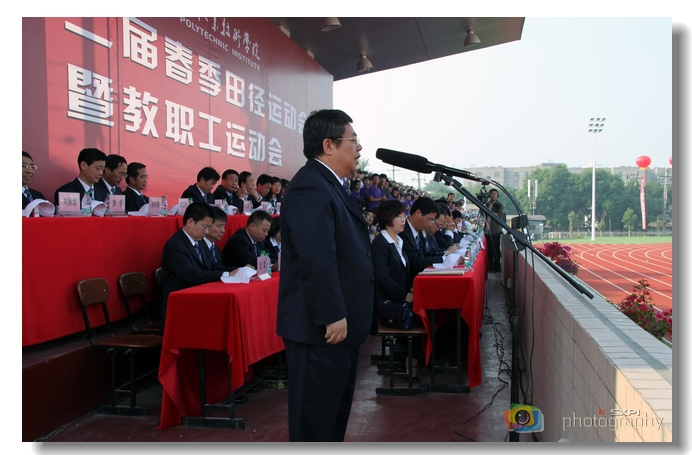 在升旗仪式结束后,崔岩院长为开幕式致辞,他代表学院全体师生向为运动场建设付出辛勤努力的同志们表示衷心的感谢!向全体运动员、裁判员致以亲切地问候!向精心筹备本届运动会的所有工作人员表示诚挚的谢意!崔岩院长希望全院师生顽强拼搏、赛出水平,共同努力把本届运动会开成一届团结的盛会,文明的盛会,精彩的盛会、圆满的盛会,并借助这一盛会,振奋精神,以满腔的热情、昂扬的斗志投身于学院的改革与发展,全力推进“省内领先、国内一流、国际知名”的高职学院建设,以优良业绩向建党90周年献礼!