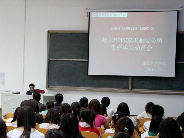 动员大会上,际华集团3502职业装有限公司领导对公司的光荣传统、雄厚实力和宏伟蓝图作了介绍。服装艺术学院领导对实习教学做了详尽的安排,并就安全工作提出了具体要求,实习学生代表做了表态发言。随后,服装学院领导将院旗授予实习班级班长,要求同学们在企业实习期间通过自己的表现,充分展现陕西工院学子的精神风貌。