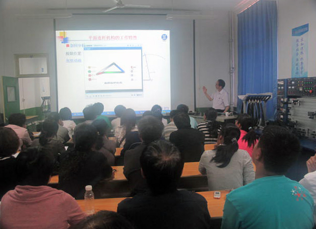 张景学教授为大家讲授了《机械设计基础》课程中“平面四杆机构的急回特性分析”的章节,他运用实体模型、模拟动画等手段直观的展示了“急回现象”,并对其特性进行数理分析。他严谨勤奋的治学态度,热情饱满的教学激情,形式多样的教学手段,感染着在座的每一位师生,为青年教师做出了示范和榜样。