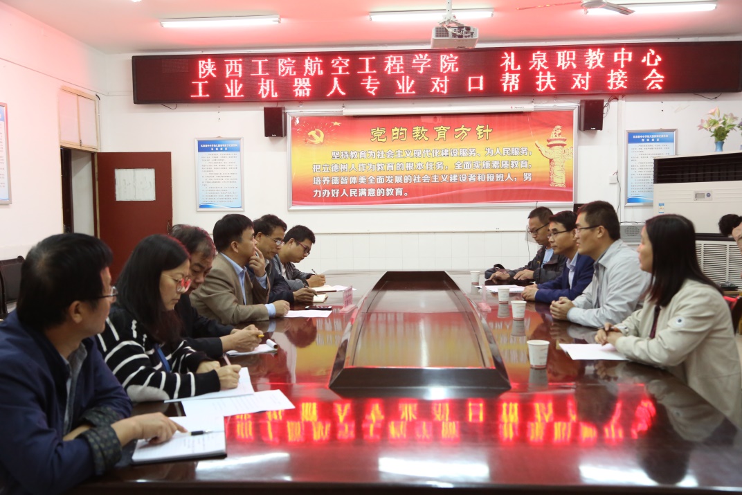 9月19日上午,航空工程学院院长李晓鹏、党总支书记刘军旭、副院长段文洁、教学办主任梁盈富一行赴我院“双百工程”结对帮扶的礼泉县职教中心开展工业机器人专业建设、人才培养对口帮扶。