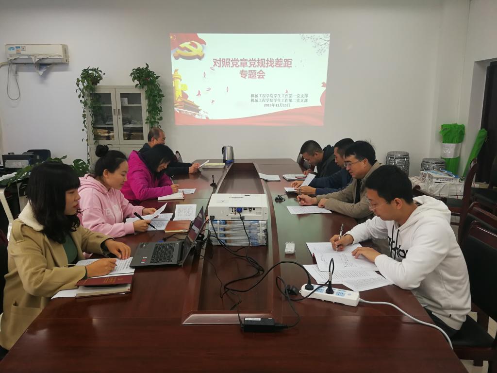 会上,机械学院各支部全体党员同志对照《党章》《准则》《条例》和《中国共产党工作机关条例》分别从相关的21个方面认真检查,查找差距,列出问题清单,制定整改方案,并将整改方案和具体整改措施作为后续“不忘初心、牢记使命”主题教育的重点内容,使“对照党章党规找差距”在各自工作岗位落地,取得成效。