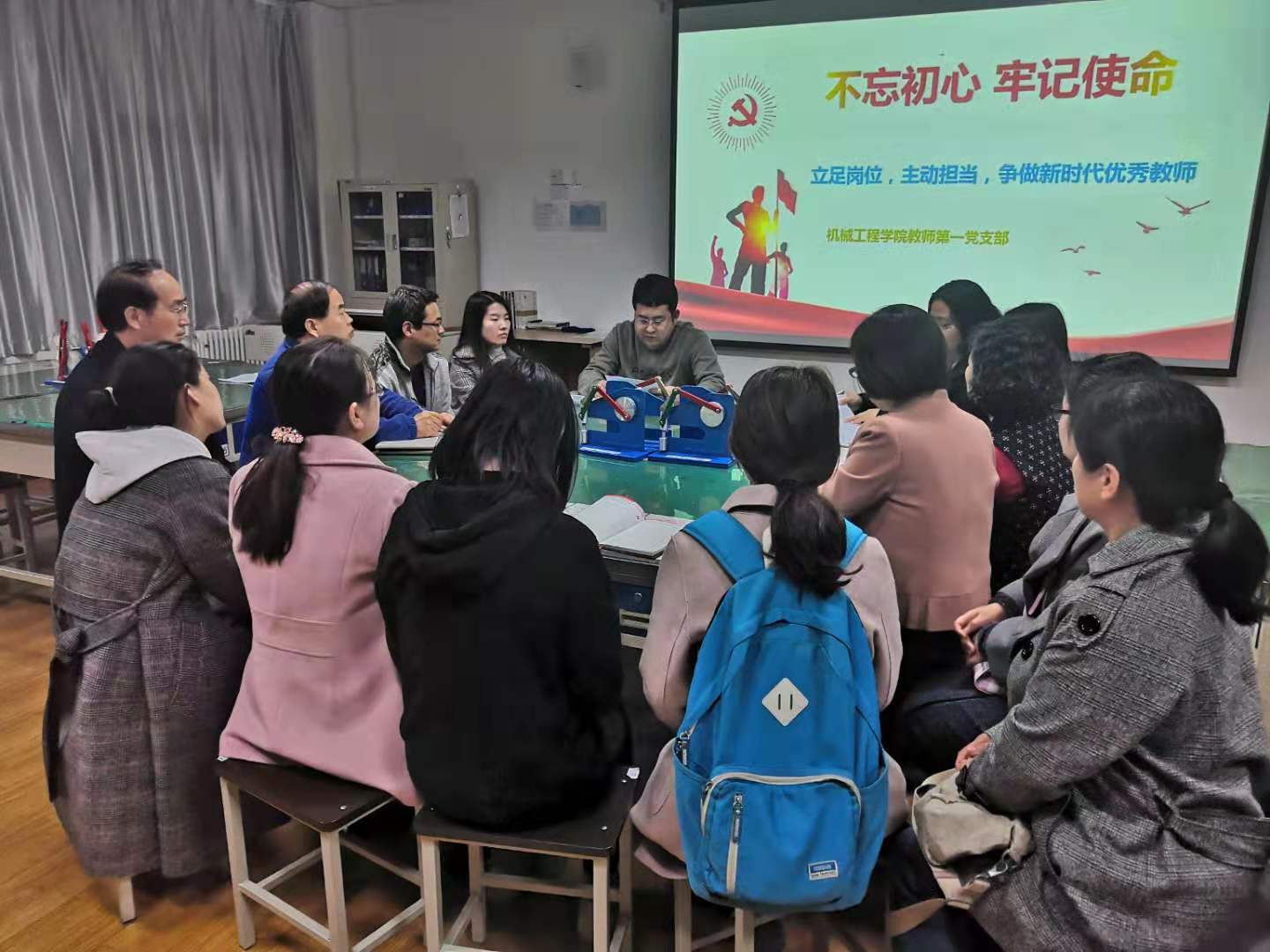 11月18日下午,机械学院教师第一党支部在精艺楼2014召开“不忘初心、牢记使命——立足岗位,主动担当,争做新时代的优秀教师”主题教育学习交流会,会议由教师第一支部书记张文亭主持。