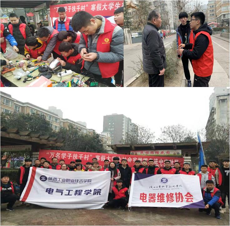 根据学院《关于组织开展2019-2020学年寒假大学生社会实践活动的通知》文件精神,提高大学生服务他人、奉献社会的责任意识,1月9日,电气工程学院电气维修协会与学生会干部组成30人实践小分队,在辅导员老师的带领下前往咸阳市中宏社区开展义务维修家电活动。