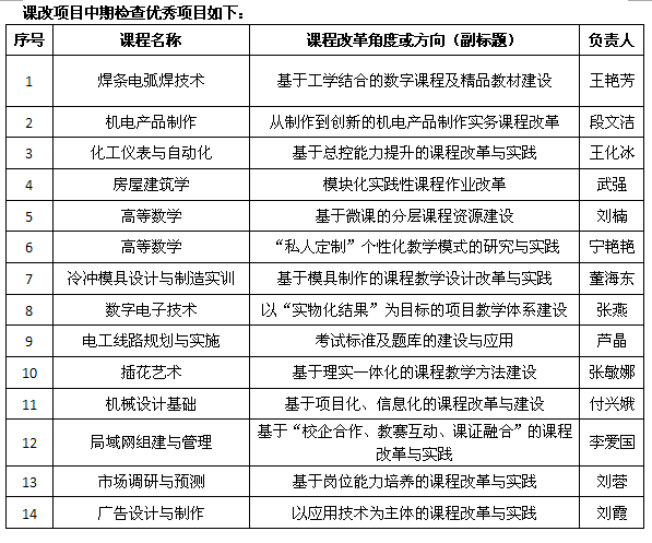 随后各小组分别召开总结会议,总结分析我院课改项目的总体进度及完成质量,并提出改进意见。本次检查中项目的总体完成度均在60%以上,课程改革的内容详实、丰富,初步达到我院课程改革要求,专家们一致认为课改项目中优秀项目均采用“理实一体”构建项目教学体系,实践环节比例较高,课件内容、教学手法较丰富,预期成果完成较均衡,完成任务量的在80%以上,且边使用边建设,有较高的推广价值,对创新我院人才培养方式,提高人才培养质量起到了积极的推动作用,个别项目仍存在进度较慢、成果较为单一的情况,对此教务处将做好项目后续的督促检查工作,以保障各项目按期顺利完成。