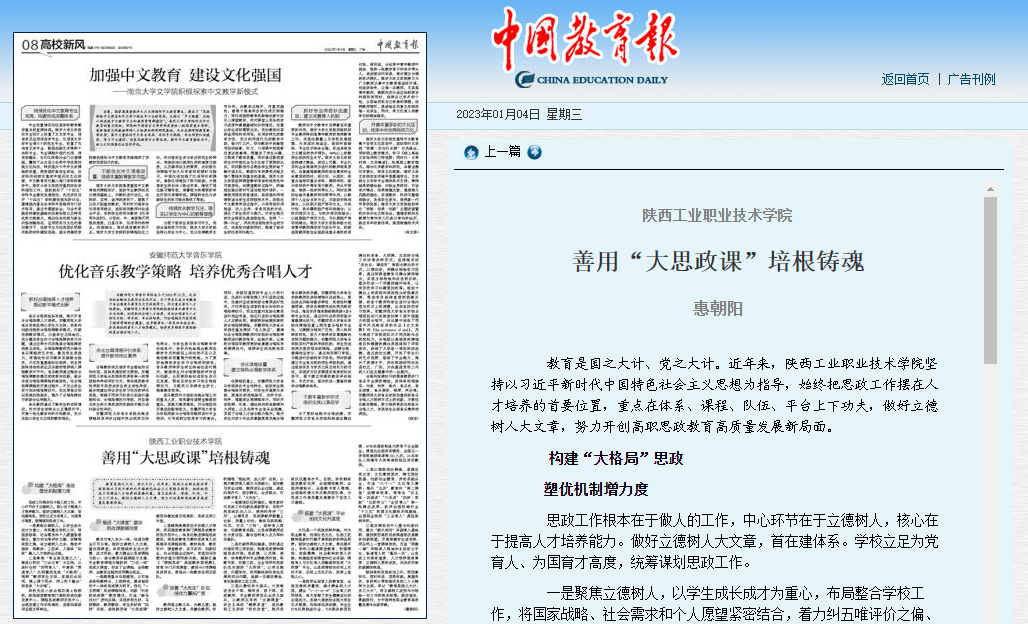 三是发挥思创中心整合创新作用,建立“薪火相传”实践育人基地群,建好陕西高校思政课虚拟仿真教学创新联盟,开展职教学生读党报、师生同上一堂课等活动,打造“两微一端”网络育人阵地和E思政云平台,畅通育人的“最后一米”,让思政工作更有温度、人才培养更有厚度、立德树人更有成效,先后多次被权威媒体报道。