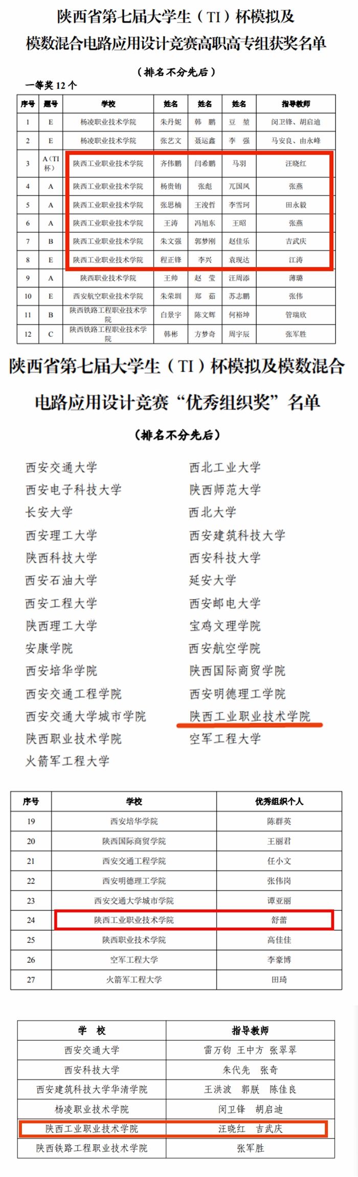 11月23日,陕西省教育厅公布了2020年全国大学生电子设计竞赛陕西赛区获奖名单,我院成绩再创新高。电气工程学院、信息工程学院选派的代表队共取得一等奖6项、二等奖6项、三等奖1项的好成绩,其中电气学院齐伟鹏、闫希鹏、马羽3名同学组成的代表队荣获高职高专组“TI”杯,我院被授予“优秀组织单位”,舒蕾同志获“优秀组织个人”,汪晓红、吉武庆被评为“优秀指导教师”。