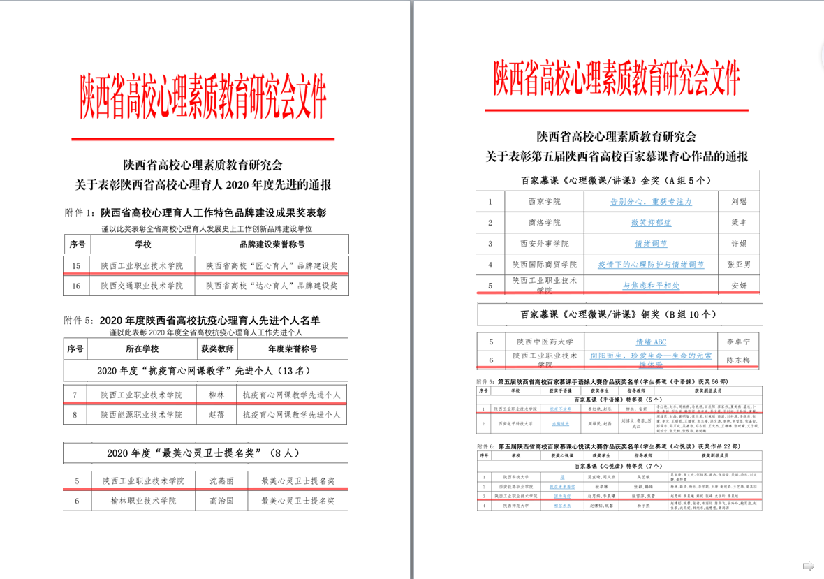 为了总结年度工作和推广优秀成果,提升我省高校心理育人工程质量,陕西省高校心理素质教育研究会开展了“陕西省高校心理育人工作成果评选活动”“第五届陕西省高校百家慕课心理育人作品大赛”“第二届陕西省高校百家育心艺术作品大赛”,我院心理育人工作获多项省级表彰。