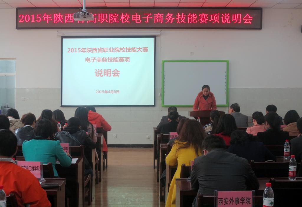 4月9日,2015年陕西省高职院校电子商务技能竞赛赛项说明会在我院汽车工程与服务技术训练中心召开。中教畅享(北京)科技有限公司总经理黄学全、教务处副处长刘清、汽车与物流学院副院长王永莲和来自省内22所职业院校的领导及教师代表50余人参加会议,会议由汽车与物流学院实训中心主任陈昊平主持。