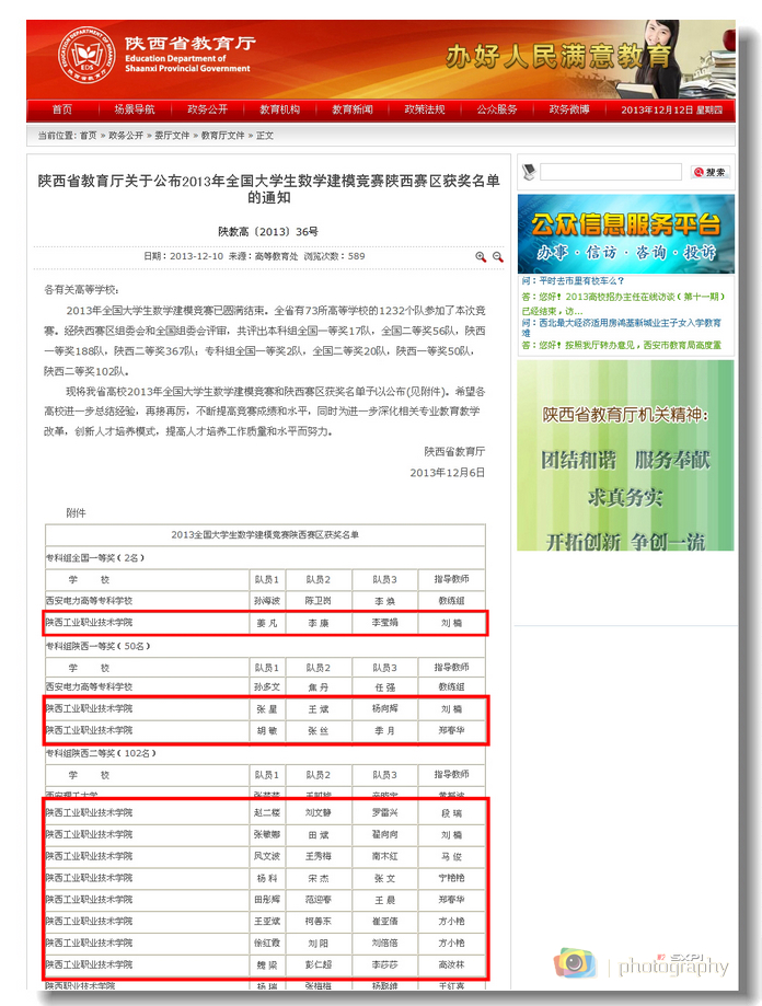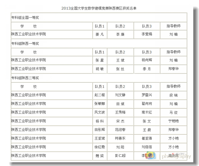 日前,陕西省教育厅公布了2013年全国大学生数学建模竞赛获奖名单,我院学生在该项竞赛陕西赛区及全国比赛中取得了骄人成绩,共获得全国一等奖1项,陕西省一等奖2项、二等奖8项。