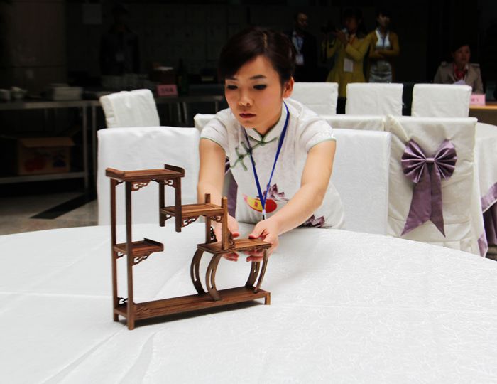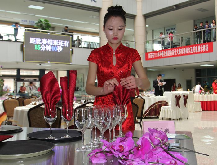 “中餐主题宴会设计”赛项以餐饮业实际经营中主题宴会设计的标准和要求为主线,涵盖职业形象展示、台面创意设计、菜单设计、餐巾折花、中餐宴会摆台、斟酒、英语口语、专业理论、现场分析等内容。 大赛得到了学院的重视,备战期间,工商管理学院领导重视、部门支持、教师钻研、选手努力,拟计划撰方案、做好各项协调工作,为大赛的顺利进行提供了保障。