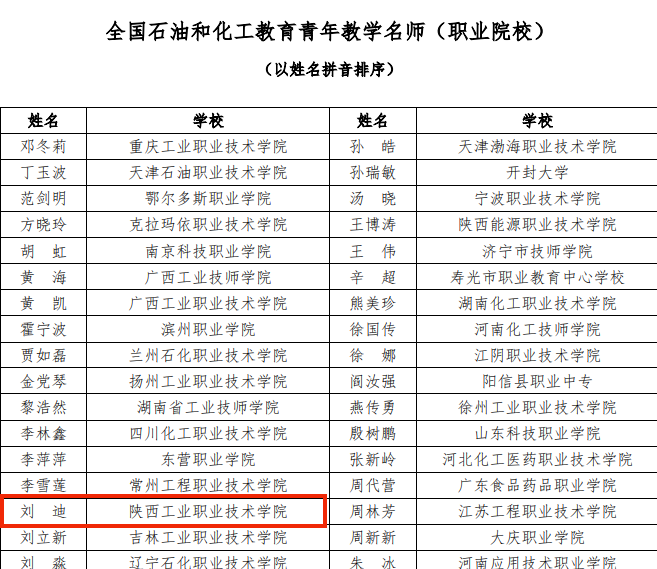 日前,由中国化工教育协会开展的“全国石油和化工教育青年教学名师、优秀教学团队、优秀教学管理人员认定”落下帷幕,我校化工与纺织服装学院分析检验技术专业教学团队被认定为“全国石油和化工教育优秀教学团队”,刘迪教授被认定为“全国石油和化工教育青年教学名师”。