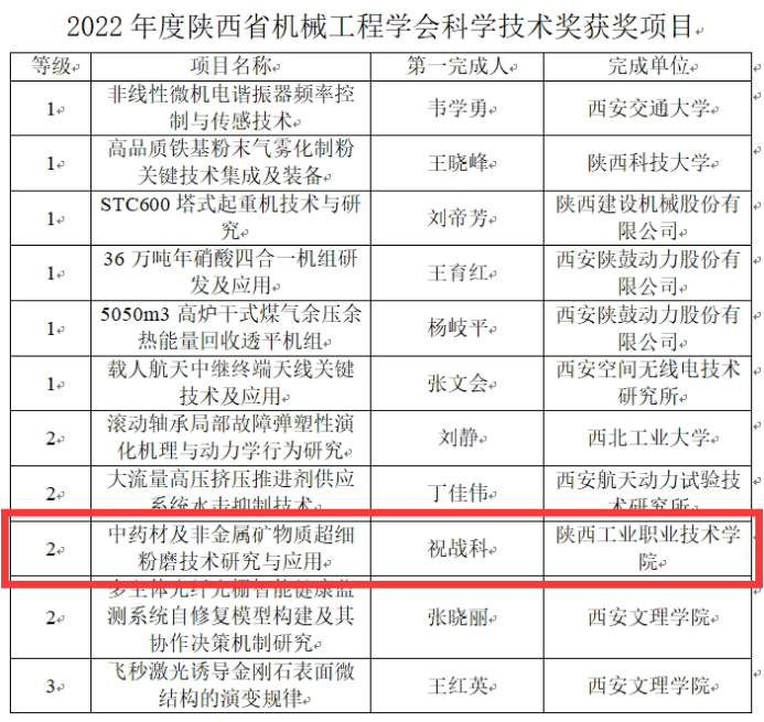 近日,陕西省机械工程学会科学技术奖会评在西安交通大学出版大厦举行,陕西省机械工程学会理事长蒋庄德院士、常务副理事长王润孝、副理事长兼秘书长景蔚萱和监事长任国梁出席了会议。评审专家组从10个不同单位的22个申报项目中,评出一等奖6项、二等奖4项、三等奖1项。我校航空工程学院祝战科教授团队主持完成的《中药材及非金属矿物质超细粉墨技术研究与应用》科研成果获科学技术奖二等奖。