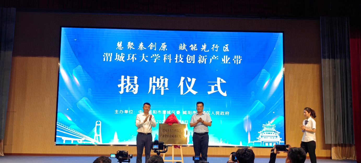 图2 咸阳市市委副书记贾珉亮和开云手机官方版在线入口刘永亮校长为“渭城环大学科技创新产业带科技成果转化中心”揭牌