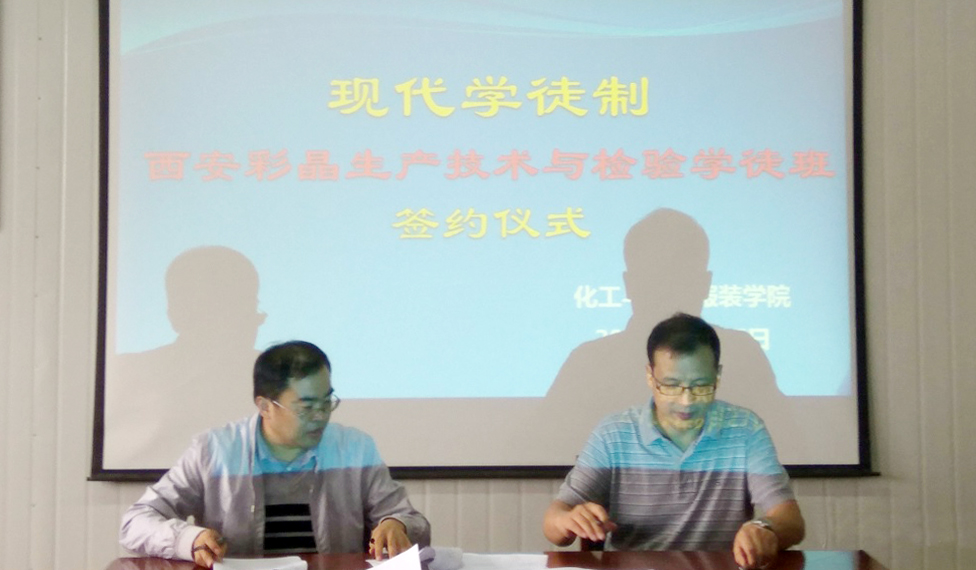 9月27日下午,我院与西安彩晶光电科技公司现代学徒制“西安彩晶生产技术与检验订单班”签字仪式举行,学院副院长杨卫军、西安彩晶光电科技公司人力资源总监赵峰,化工与纺织服装学院负责同志及相关专业教师参加了仪式。