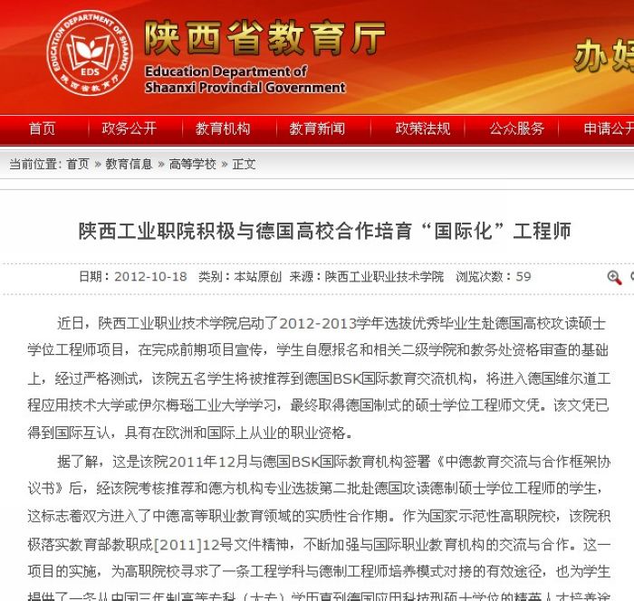 10月18日,陕西省教育厅网站对我院与德国高校合作培育“国际化”工程师项目进行了报道。