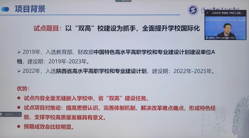 自2022年6月被确定为教育对外开放评价改革试点项目学校以来,我校结合新时代中、省职业教育政策,挖掘国际交流合作支撑学校高质量发展潜力,从国际化人才培养、开发国际化教学标准、服务企业“走出去”等10个方面设置了工作清单。力求通过教育评价改革试点工作,破解发展难题,建立高效机制,促进学校国际交流合作高质量发展。