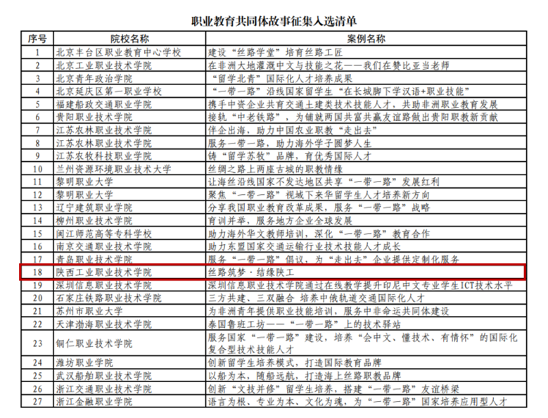 近日,中国职业技术教育学会公布“职业教育共同体故事征集”案例名单,我校《丝路筑梦·结缘陕工》案例成功入选。本次案例征集旨在展现职业教育为“一带一路”沿线国家更好融入国际产业分工体系提供人才基础的作为与担当,全国共有24所职业院校的职教故事入选。