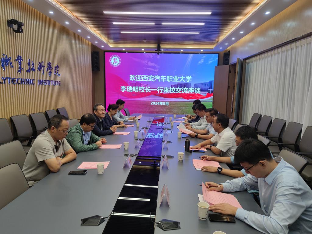 李瑞明校长对我校的热情接待表示感谢,简要介绍了西安汽车职业大学的历史沿革、办学特色、专业设置等基本情况,并希望与我校进一步加强校际交流与合作,共同促进两校高质量发展。随后,双方就校企合作模式、产教融合实训基地建设等内容进行了深入交流。