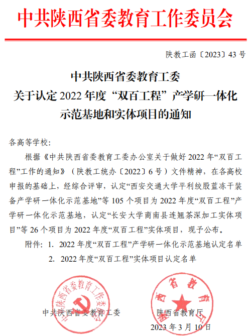 近日,中共陕西省委教育工作委员会下发了《关于认定2022年度“双百工程”产学研一体化示范基地和实体项目的通知》(陕教工函〔2023〕43号),分别认定了105个基地以及26个项目为2022年度陕西省“双百工程”产学研一体化示范基地和实体项目,我校结对帮扶礼泉县共建的“开云手机官方版在线入口产学研一体化示范基地”被认定为2022年度陕西省“双百工程”产学研一体化示范基地。