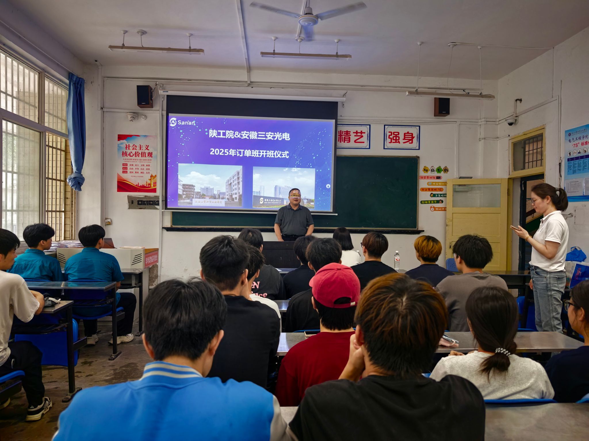6月18日下午,电气工程学院与安徽三安光电有限公司合作组建的订单班开班仪式在笃学楼B101成功举行。安徽三安光电有限公司招聘经理刘玲、培训主管陶琴和电气学院党总支书记刘其兵、学工办主任陈春山及订单班全体学员共同参加了开班仪式。