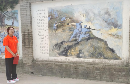 图上为实践团队员站在指挥员回忆录壁画前向其他成员讲述战斗故事