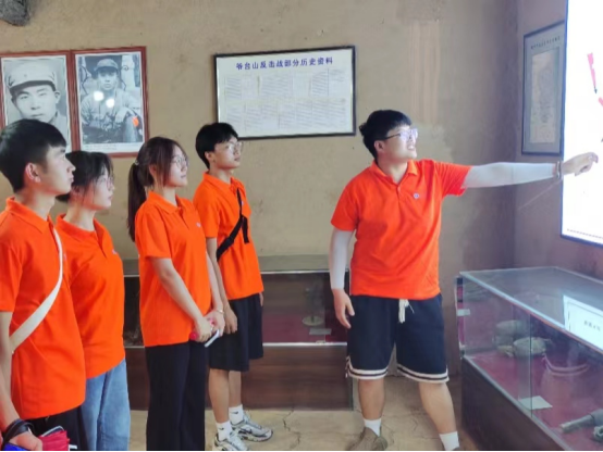 图上为实践团队员在指挥部旧址内为其他队员讲解作战计划图