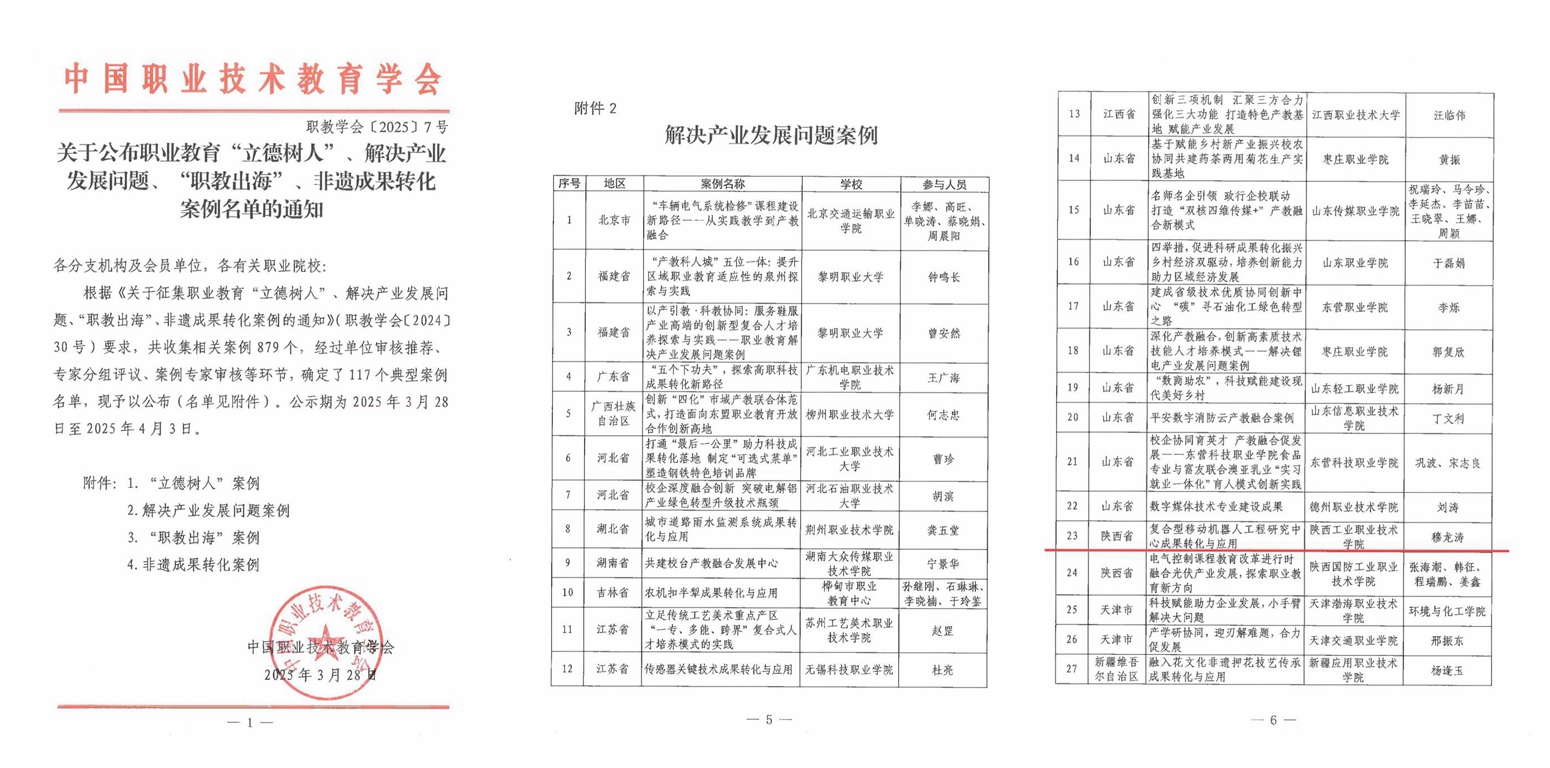 近期,中国职业技术教育学会公布《职业教育“立德树人”、解决产业发展问题、“职教出海”、非遗成果转化案例》典型案例名单,我校报送的解决产业发展问题案例成功入选。