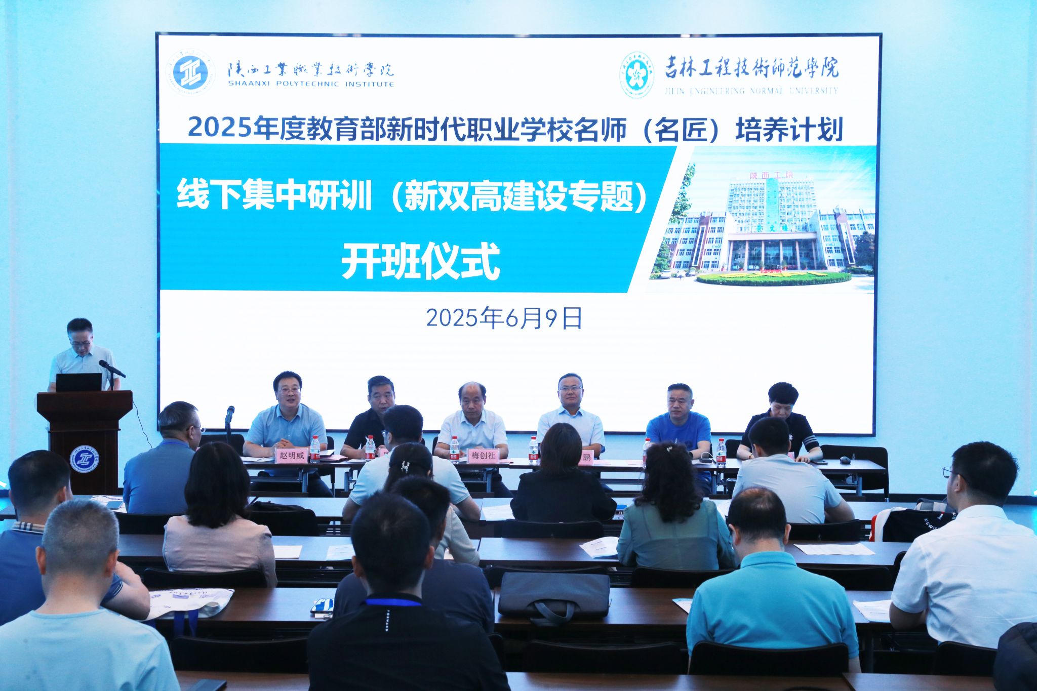 6月9日上午,由我校承办的2025年度教育部新时代职业学校名师(名匠)培养计划线下集中研训(新双高建设专题)正式开班,开班仪式在渭城校区先进制造产业学院展厅举行。副校长梅创社、吉林工程技术师范学院副院长张鹏,我校人事处、机械工程学院负责同志,及培训班管理人员、全体学员参加了开班仪式。
