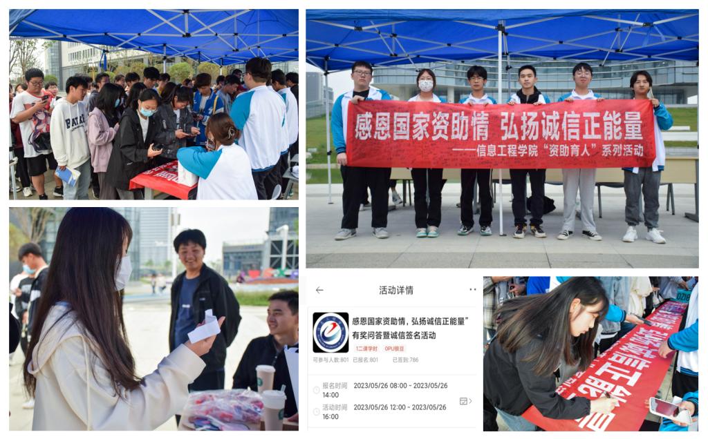 为推动学校资助育人系列主题活动的深入,进一步增强学生的诚信意识,营造良好的校园氛围,强化资助育人效果。5月26日下午,信息学院在经开校区湖前广场组织开展了“感恩国家资助情,弘扬诚信正能量”有奖问答及诚信签名活动,历时4小时,共计786名学生参与了本次活动。