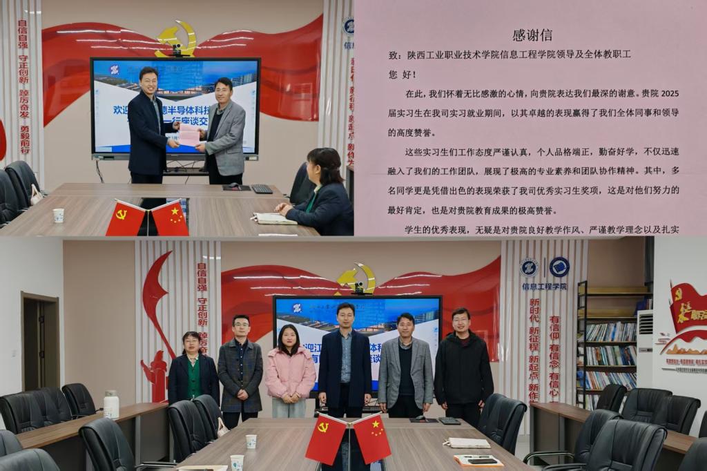 会上,白国政院长首先就信息工程学院办学历程、专业设置、人才培养、校企合作等方面情况做了详细介绍。随后,企业人资负责人宋长雷向我校介绍了公司的发展历程、企业架构、工作环境及岗位需求,表示希望能与我校在订单班人才培养方面加深合作,并当场递交感谢信,对信息学院2025届入职实习生的出色表现表示了高度肯定。最后,王伟书记就后续2025届校招、2026届订单班开设等具体工作措施、推进情况、下步打算与企业进行了交流。