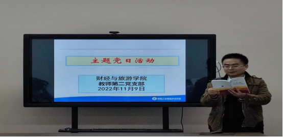 11月9日下午,财经与旅游学院党总支教师第二党支部在经开新校区崇理楼D504开展“学习二十大 党员来读书”主题党日活动,全体党员参加会议,会议由教师第二党支部书记陈晶主持。