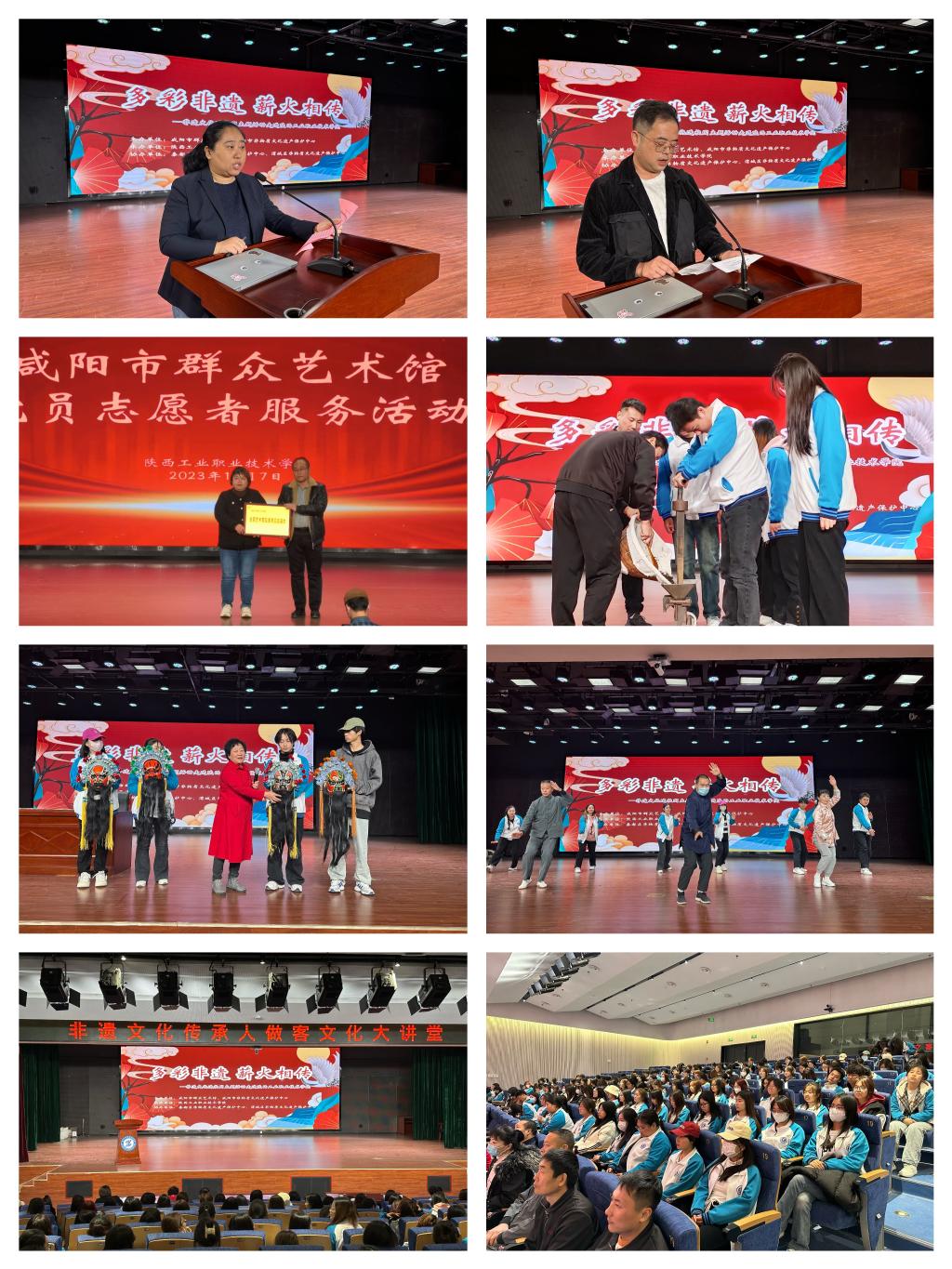 为全面贯彻落实习近平总书记关于文化遗产保护传承工作的重要论述,推进非物质文化遗产的传承与发展,让同学们进一步了解陕西的非遗文化,树立保护和传承非遗文化意识,12月7日,美育部联合财经与旅游学院,特邀咸阳市群众艺术馆、咸阳市非物质文化遗产保护中心、秦都区非物质文化遗产保护中心等多家单位,在经开校区图文报告厅开展了非遗文化传承人做客文化大讲堂活动。出席本次活动的有咸阳市群众艺术馆非遗保护中心办公室主任王佳梅、副主任屈熙寓,陕西工院美育部办公室主任毛建芳,财经与旅游学院学工办主任杜娟及财经与旅游学院辅导员、学生共计230余人。