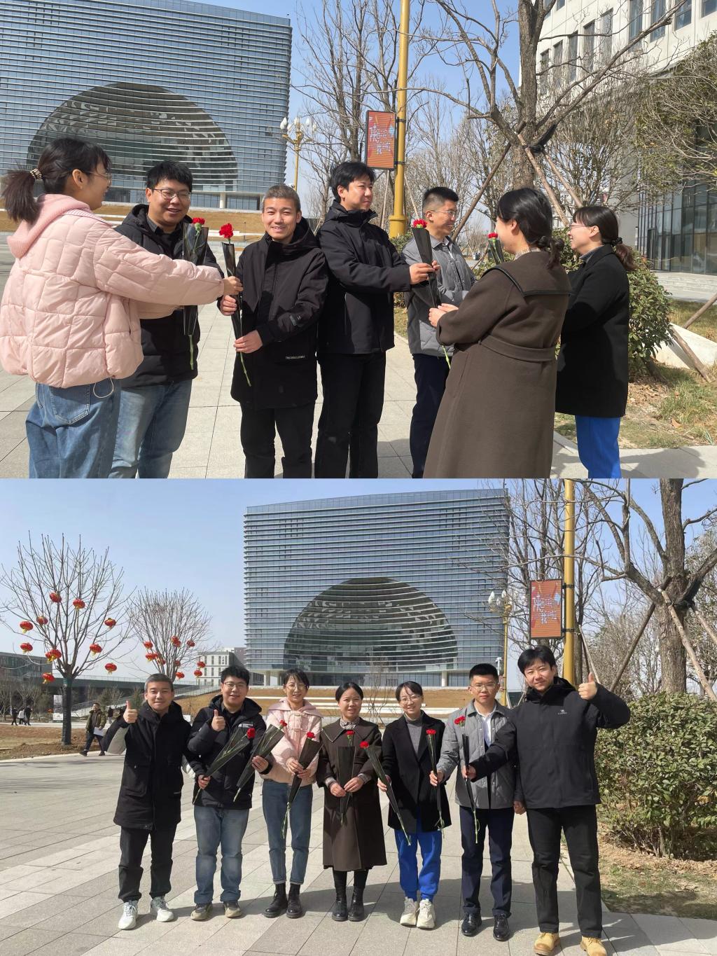 鲜花送给“他”。活动中,女教职工把手中的鲜花送给男同事,感谢对自己工作的帮助与配合,收到鲜花和祝福的老师们脸上的笑容和手中的鲜花交相辉映。